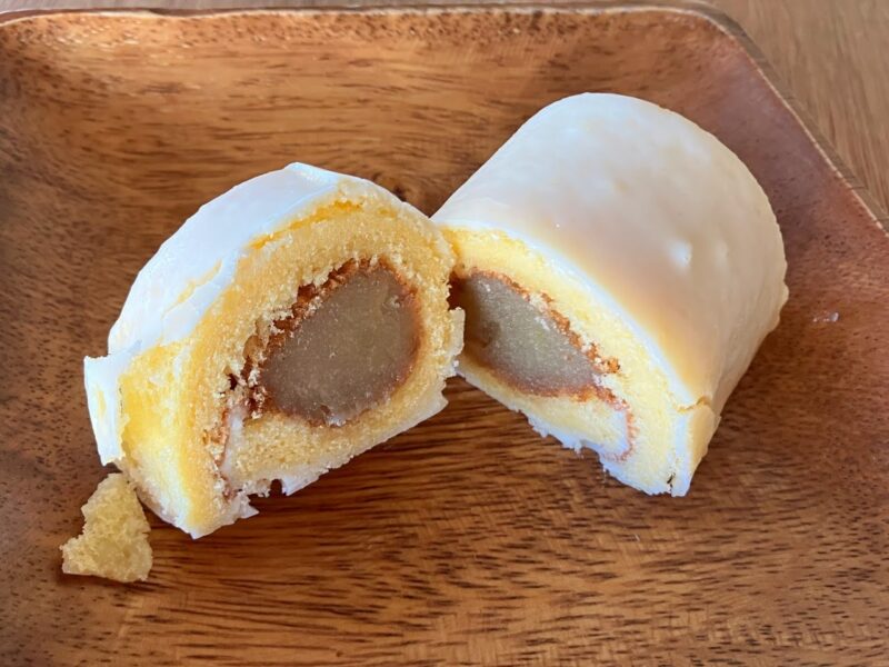まろんろーるの包みを開けるとコーティングされたロールケーキが登場。