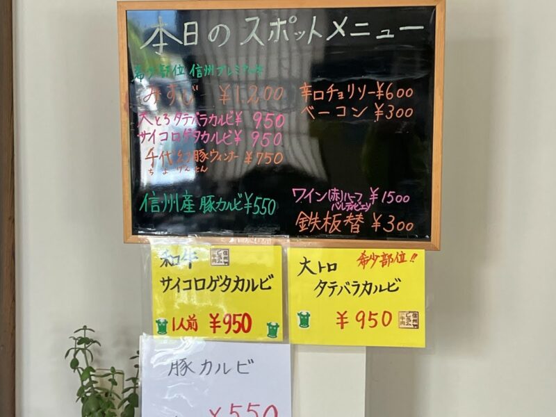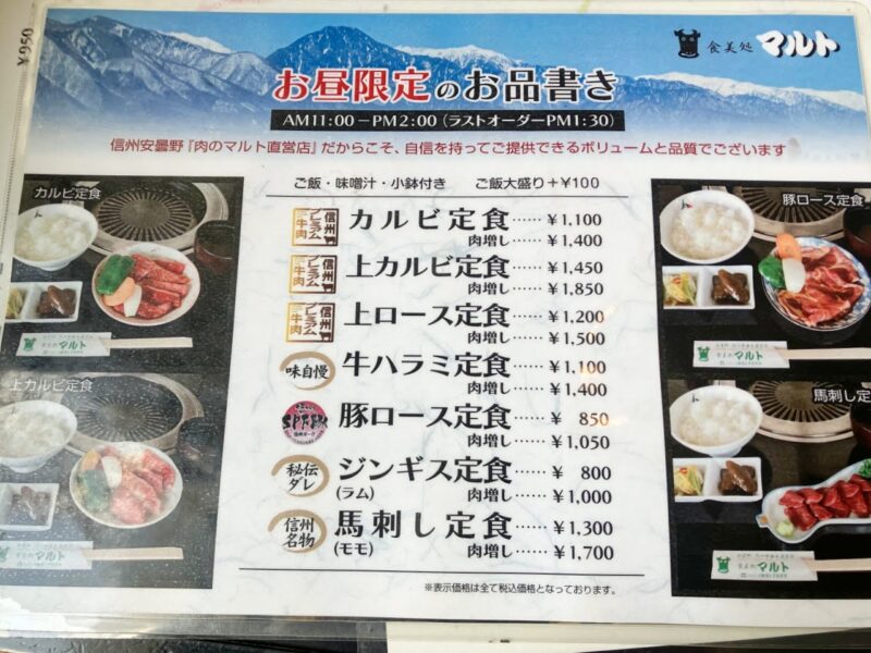 ランチメニューは、カルビ・上カルビ・上ロース・上ハラミなど。