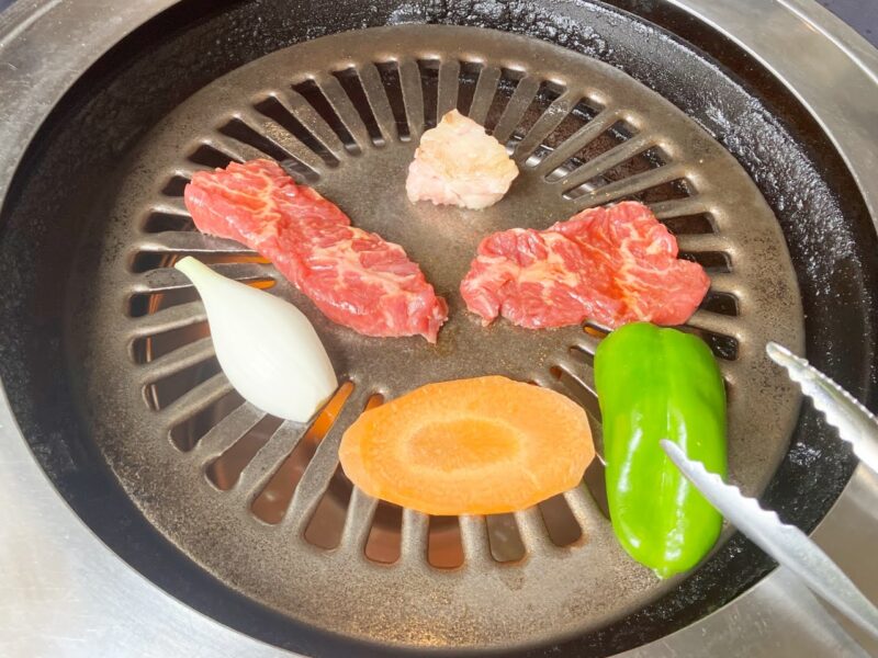 結構厚みのあるハラミ。野菜はじっくりと遠火で。