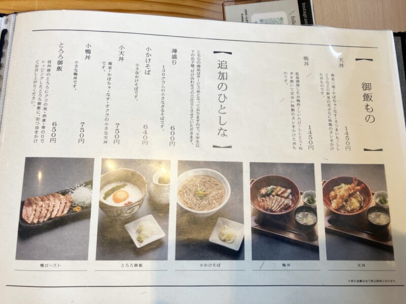温そばが常にあるのも信州らしいポイント。おろしや鴨南蛮と定番が並びます。