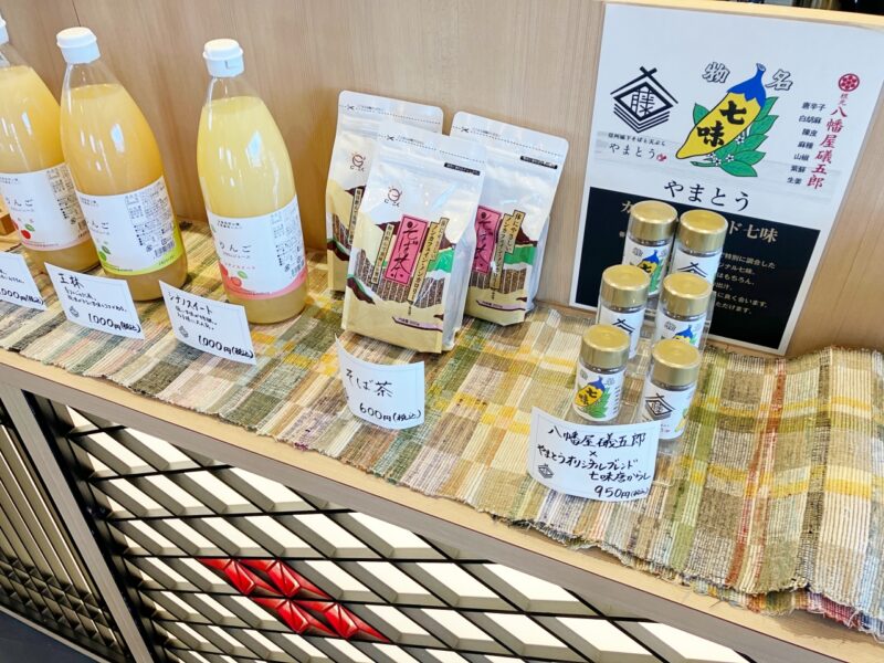 店内では、そば茶ややまとうオリジナルの八幡屋義五郎の七味唐辛子なども販売。信州のお土産もゲットできるのも魅力の一つです。