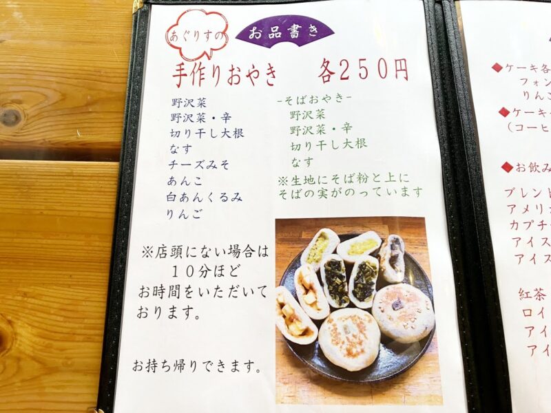 生地はプレーンと、そば粉とそばの実が入っているそばおやきがあります。