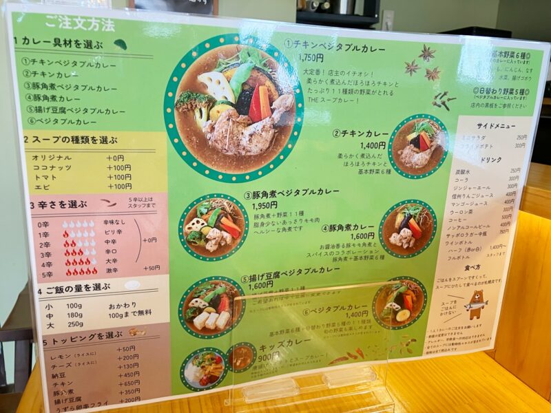 「スープカレーグラスプ」のメニューは、自分の好みで選べます。カレーの具材を選び、スープ・辛さ・ご飯の量。最後にトッピングも。