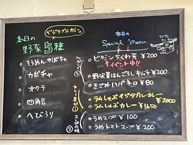 野菜はその日によって変わるので、黒板でチェックしてください。スペシャルトッピングやメニューもありますよ。
