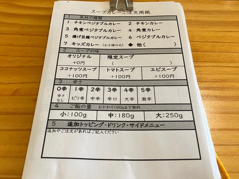 注文するときはこの紙に記入して頼みます。ご飯の量やスープもチェックを忘れないようにしてくださいね。