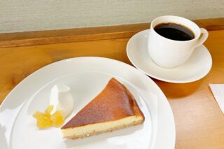 今回注文したのは、ブレンドとラムレーズンのチーズケーキ。