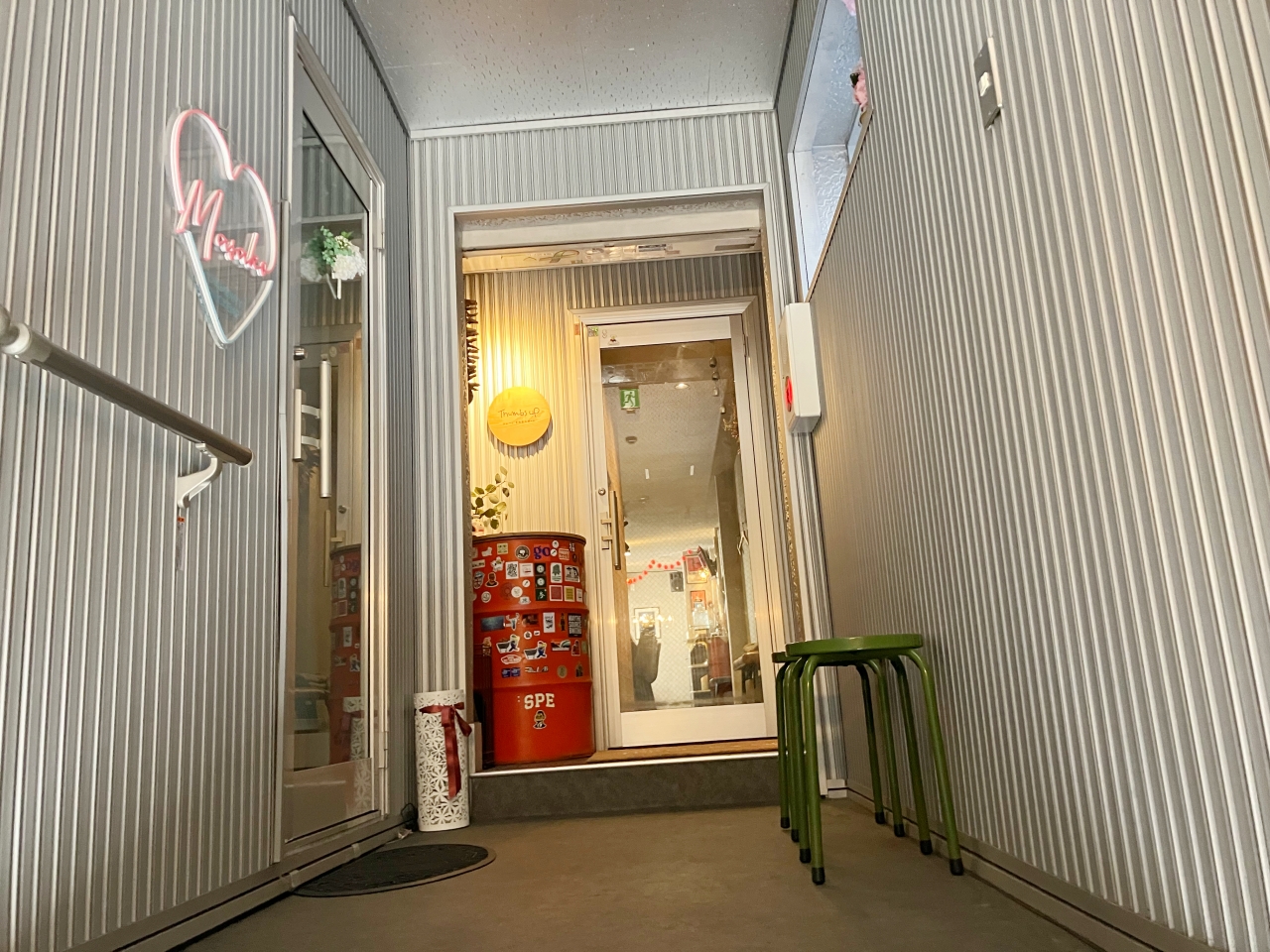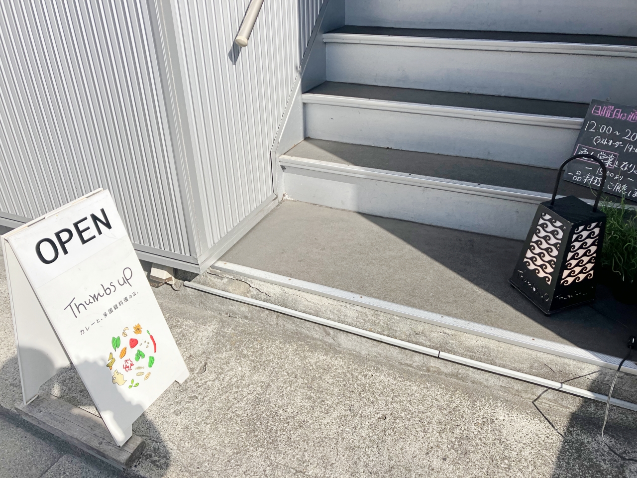 階段を上がると、「Thumbs Up サムズアップ」の入り口が見えてきます。誘われて入りたくなりそうな雰囲気していますよね。