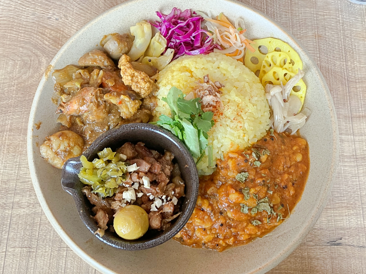 今回は、ダルカレーとエビとカリフラワーのチリソースカレーを選びました。副菜も盛り沢山で、食べ終わったら満腹。スパイスが効いた食事ってなんでこんなにおいしく感じるのでしょうね。