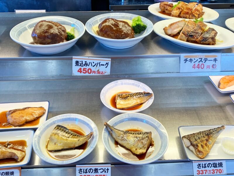 煮込みハンバーグにチキンステーキ、さばの煮付けや塩焼きが並んでます。