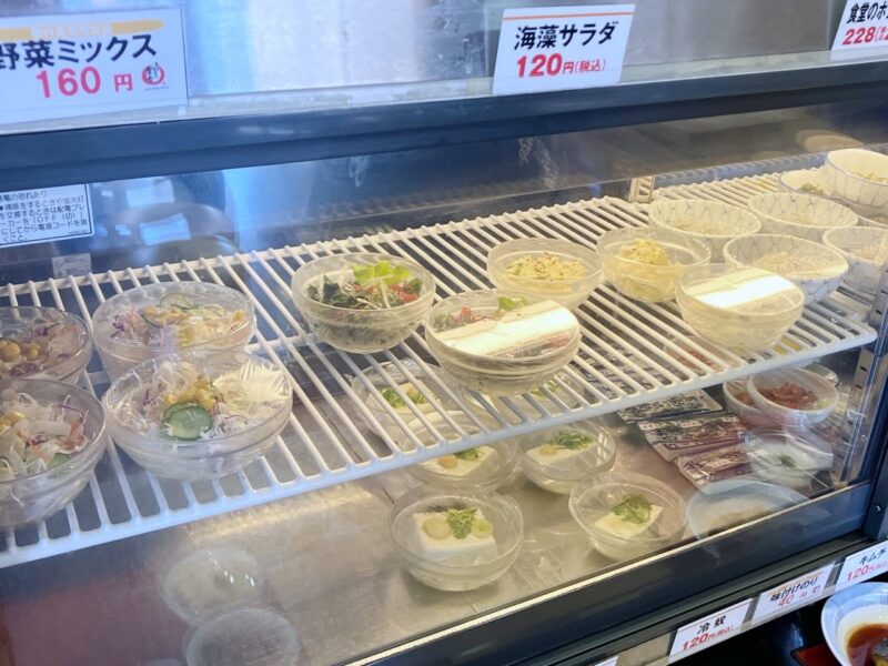 冷蔵のショーケースにはサラダやお刺身などがあります。