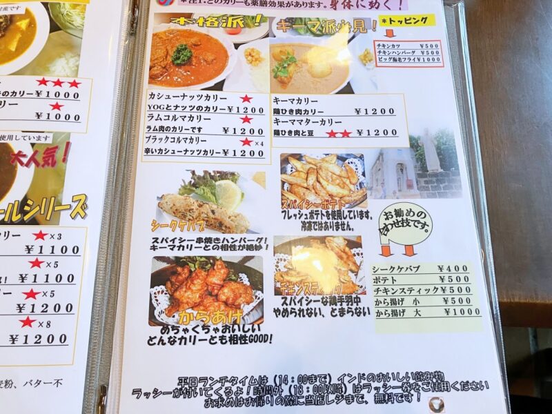 チキンカリーやインドカリー、カシミールカリーなどなど。